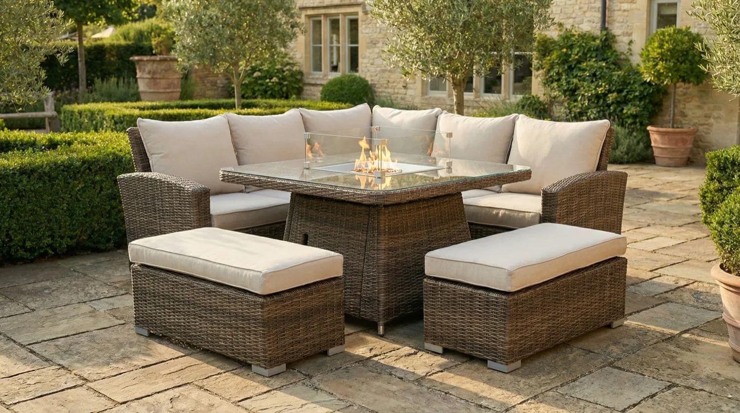 Rattan and aluminium modular sofas with integrated rising fire pits. The ultimate garden centerpiece. Gas-powered warmth meets luxury seating.